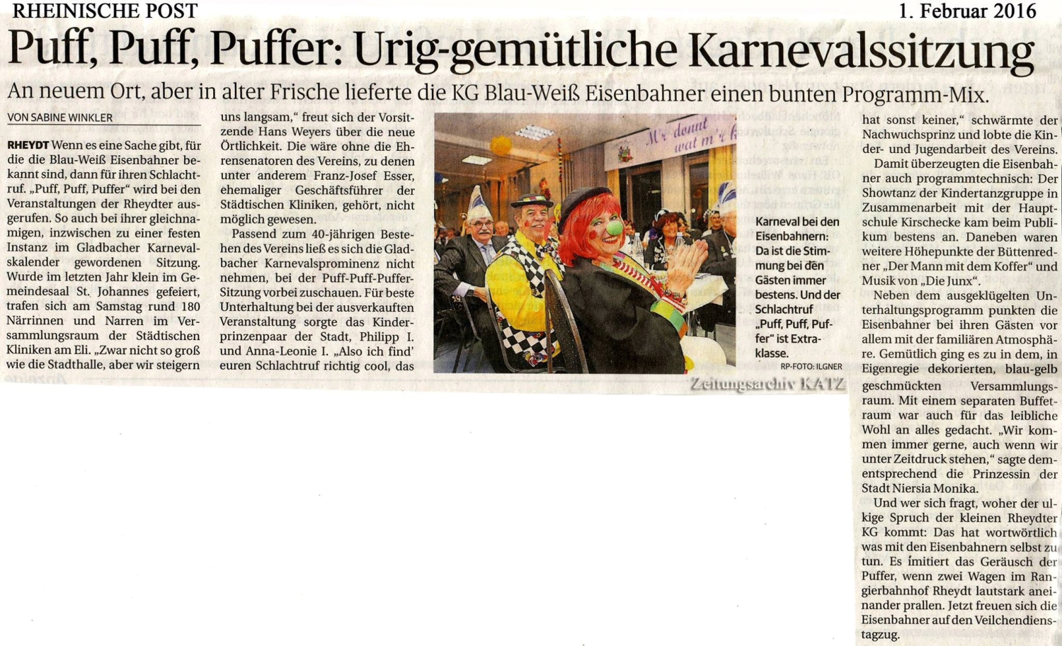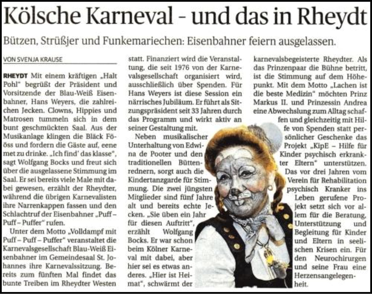 (C) 2011 Karnevalsgesellschaft Blau-Weiss EisenbahnerWebdesign und Webadministration Hans WeyersAlle Bilder auf dieser Homepage sind urheberrechtlich geschütztVolldampfmitPuff-Puff-PufferSamstag 15.02.2020, Einlaß 18.00 Uhr, Beginn 20.00 UhrVerwaltungsgebäude Städtische KlinikenHubertusstr. 100Eingang Wildstraße41239 MönchengladbachWo bekomme ich Karten?Reservierung / BestellungTelefon 02161-631864MachenSie Pause vom Alltag.StärkenSie sich am Buffet.ErlebenSie die Künstler hautnah.HabenSie einen schönen Abend.EserwartetSieein SpitzenprogrammmitKünstlerndesrheinischen Karnevals.Marcus MagnusChristian PapeKleinstadtrokkerHeddemer DreigestirnEt Zweigestirn